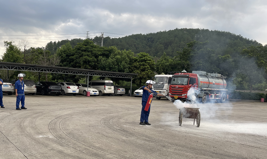 演練人員由10米外持滅火器奔向火場進行滅火,由上風向接近著火點,站在上風處1.5米—2米處用干粉滅火器撲救初起火災。人員排隊依次進行滅火實操演練。